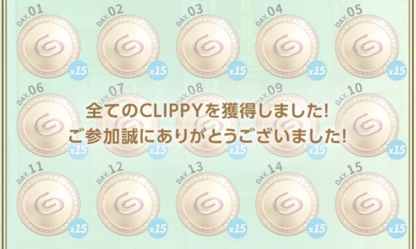今回も、1日1回15CLIPPY・15回までログインボーナスを受け取ることができます