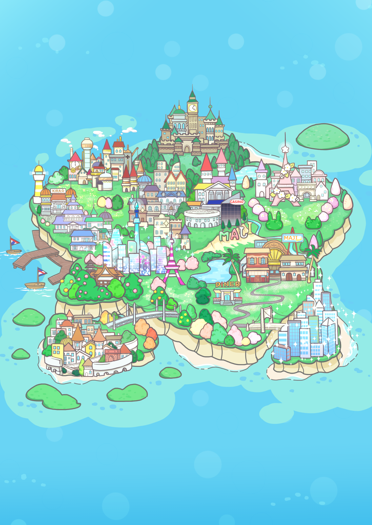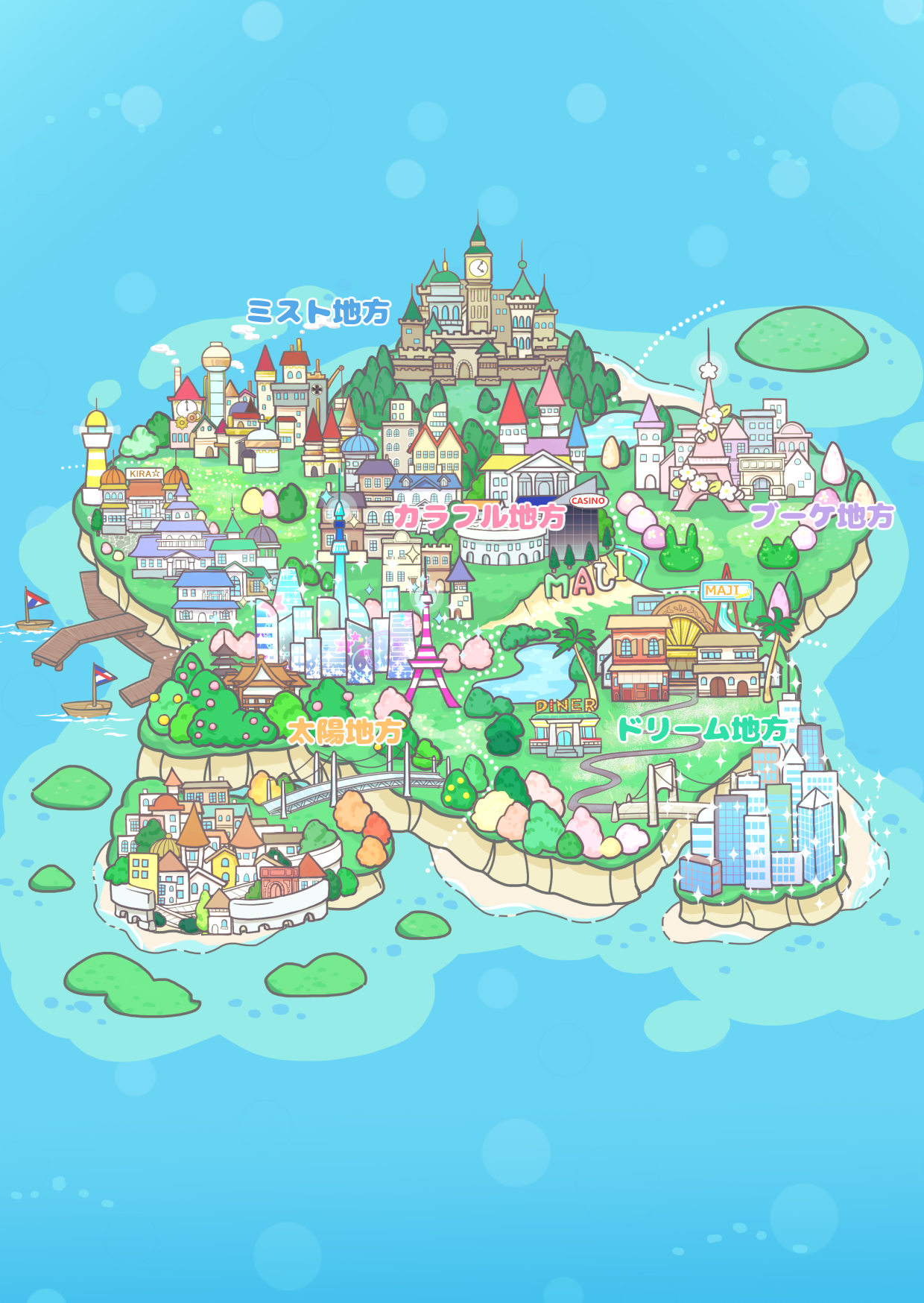 バライロシティは商業や観光の中心地、ホウセキシティは行政の中心地という設定です。